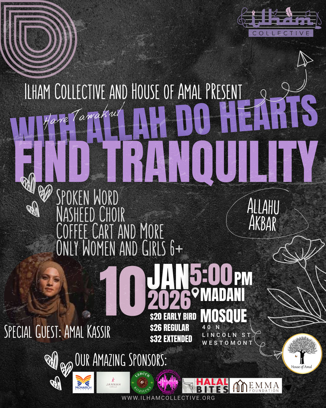 With Allah Do Hearts Find Tranquility is Ilham Collective’s 3rd full-scale recital, designed to showcase the incredible talents of women in our community. This Recital is ESPECIALLY WONDERFUL because we will be having a special guest: the Talented Author, co-founder, and Poet Amal Kassir. Thank you for our collab with HOUSE OF AMAL to make this all happen!